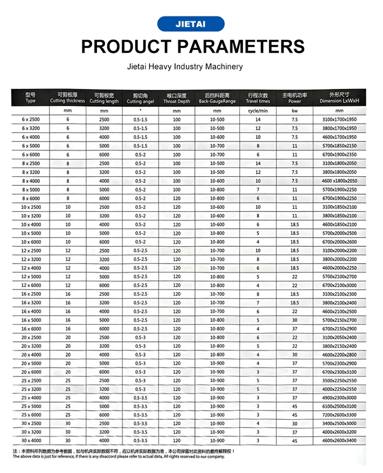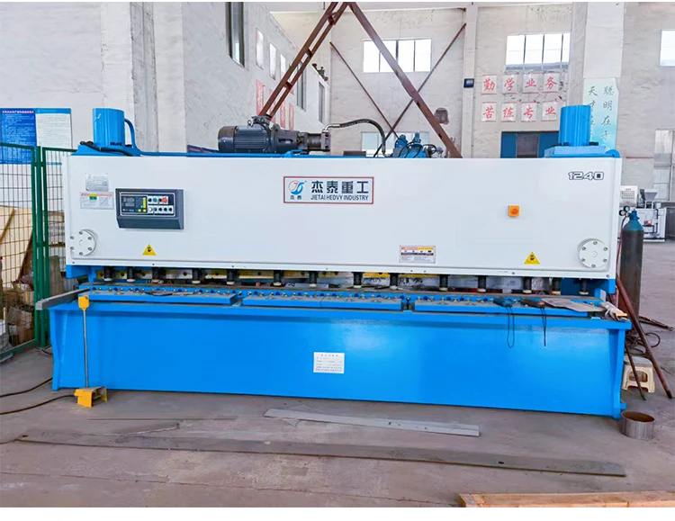 Main Features and Advantages1. High Shearing Precision: The guillotine-type shearing structure ensures uniform force on the blade. Combined with the precise positioning of the numerical control back gauge (the positioning accuracy of some models can reach ±0.1mm). it can effectively ensure the dimensional consistency of plates processed in batches and reduce plate warping and deformation.2. Strong Shearing Capacity: The hydraulic transmission system can provide large shearing force (the shearing force range of common models is 500kN-6000kN). It can shear metal plates with a thickness of 8mm-60mm and a width of 1.6m-6m. meeting the processing needs of medium and thick plates.3. Easy Operation: Manual-type equipment adjusts parameters through handles. which is simple and easy to learn. Numerical control equipment is equipped with a touch screen and PLC control system. supporting parameter storage and program calling. It can realize automated batch processing and reduce the intensity of manual operation.4. Stable and Reliable Operation: The hydraulic system adopts a mature circuit design. Combined with the rigid tool post and high-quality guide rail. the equipment has low vibration and low noise (usually ≤85dB) during operation. In addition. vulnerable parts (such as blades and seals) are easy to replace. resulting in low maintenance costs.5. Wide Adaptability: By replacing blades of different materials (such as high-speed steel blades and alloy blades). it can adapt to metal plates of different hardness. including carbon steel. stainless steel. and aluminum alloy. to meet diverse processing needs. Some models can also be equipped with pneumatic brackets and feeding mechanisms to improve the convenience of processing long and heavy plates.